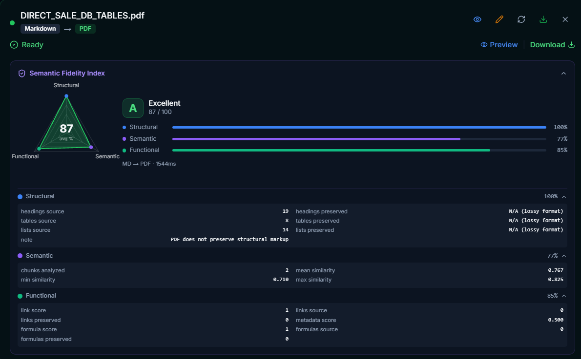 I designed a metric called the Semantic Fidelity Index (SFI) — a weighted composite score that measures how much meaning survives a document format conversion.